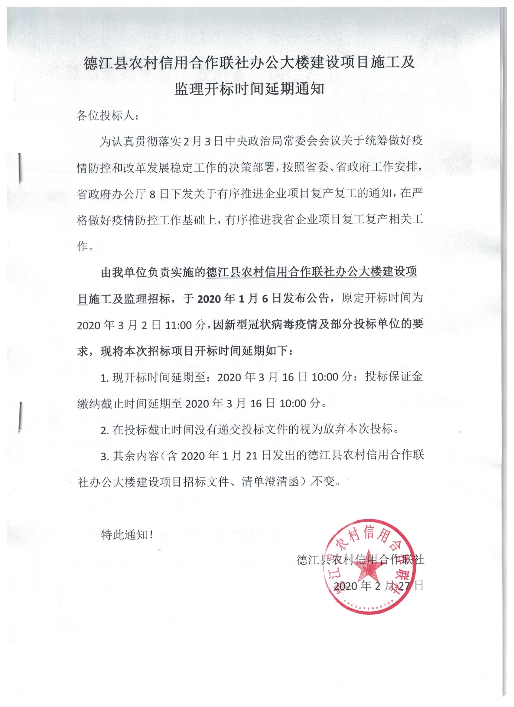 |  澄清与修改的内容: | 德江县农村信用合作联社办公大楼建设项目施工及监理开标时间延期通知各位投标人:为认真贯彻落实2月3日中央政治局常委会会议关于统筹做好疫情防控和改革发展稳定工作的决策部署,按照省委、省政府工作安排,省政府办公厅8日下发关于有序推进企业项目复产复工的通知,在严格做好疫情防控工作基础上,有序推进我省企业项目复工复产相关工作。由我单位负责实施的德江县农村信用合作联社办公大楼建设项目施工及监理招标,于2020年1月6日发布公告,原定开标时间为2020年3月2日11:00分,因新型冠状病毒疫情及部分投标单位的要求,现将本次招标项目开标时间延期如下:1.现开标时间延期至:2020年3月16日10:00分;投标保证金缴纳截止时间延期至2020年3月16日10:00分。2.在投标截止时间没有递交投标文件的视为放弃本次投标。3.其余内容(含2020年1月21日发出的德江县农村信用合作联社办公大楼建设项目招标文件、清单澄清函)不变。特此通知!德江县农村信用合作联社 2020年2月27日 |