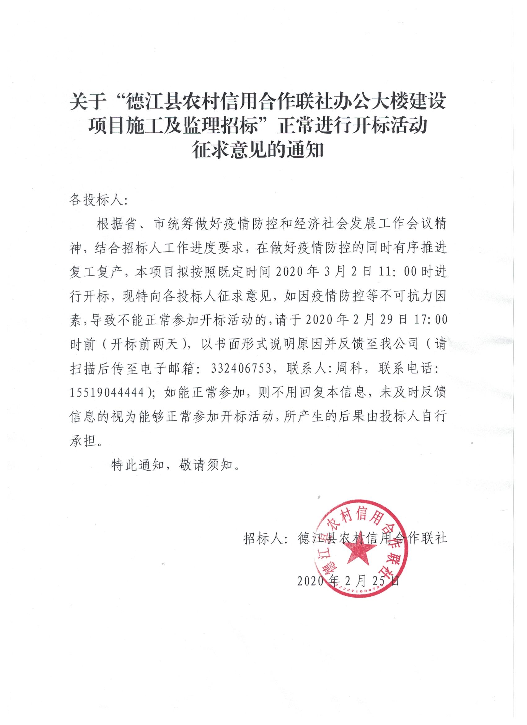 |  澄清与修改的内容: | 关于“德江县农村信用合作联社办公大楼建设项目施工及监理招标”正常进行开标活动征求意见的通知各投标人:根据省、市统筹做好疫情防控和经济社会发展工作会议精神,结合招标人工作进度要求,在做好疫情防控的同时有序推进复工复产,本项目拟按照既定时间2020年3月2日11:00时进行开标,现特向各投标人征求意见,如因疫情防控等不可抗力因素,导致不能正常参加开标活动的,请于2020年2月29日17:00时前(开标前两天),以书面形式说明原因并反馈至我公司(请扫描后传至电子邮箱:332406753,联系人:周科,联系电话:15519044444);如能正常参加,则不用回复本信息,未及时反馈信息的视为能够正常参加开标活动,所产生的后果由投标人自行承担。 特此通知,敬请须知。 招标人:德江县农村信用合作联社 2020年2月25日 |