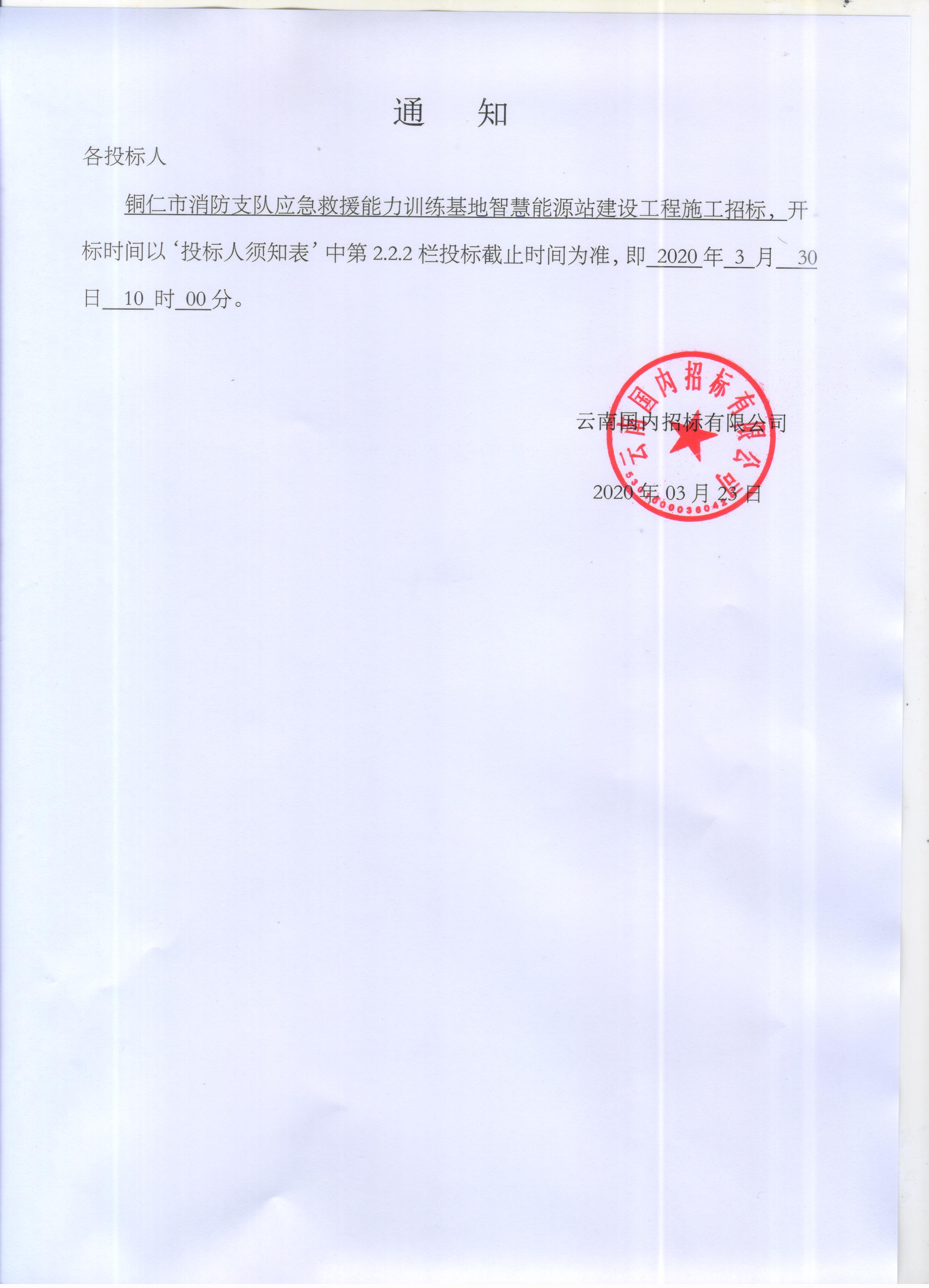 |  澄清与修改的内容: | 通知各投标人 铜仁市消防支队应急救援能力训练基地智慧能源站建设工程施工招标,开标时间以‘投标人须知表’中第2.2.2栏投标截止时间为准,即2020年3月30日10时00分。 云南国内招标有限公司 2020年03月23日 |