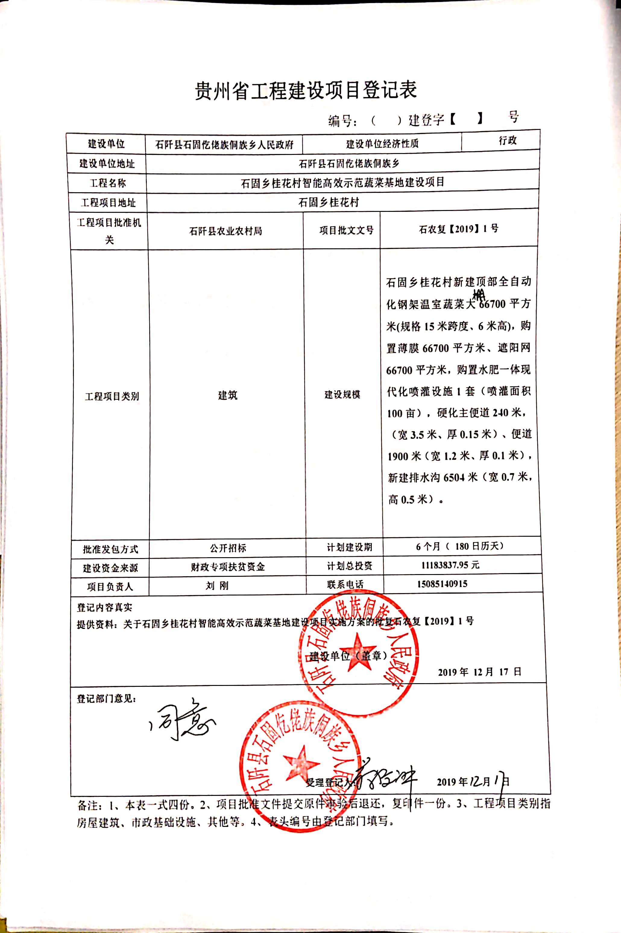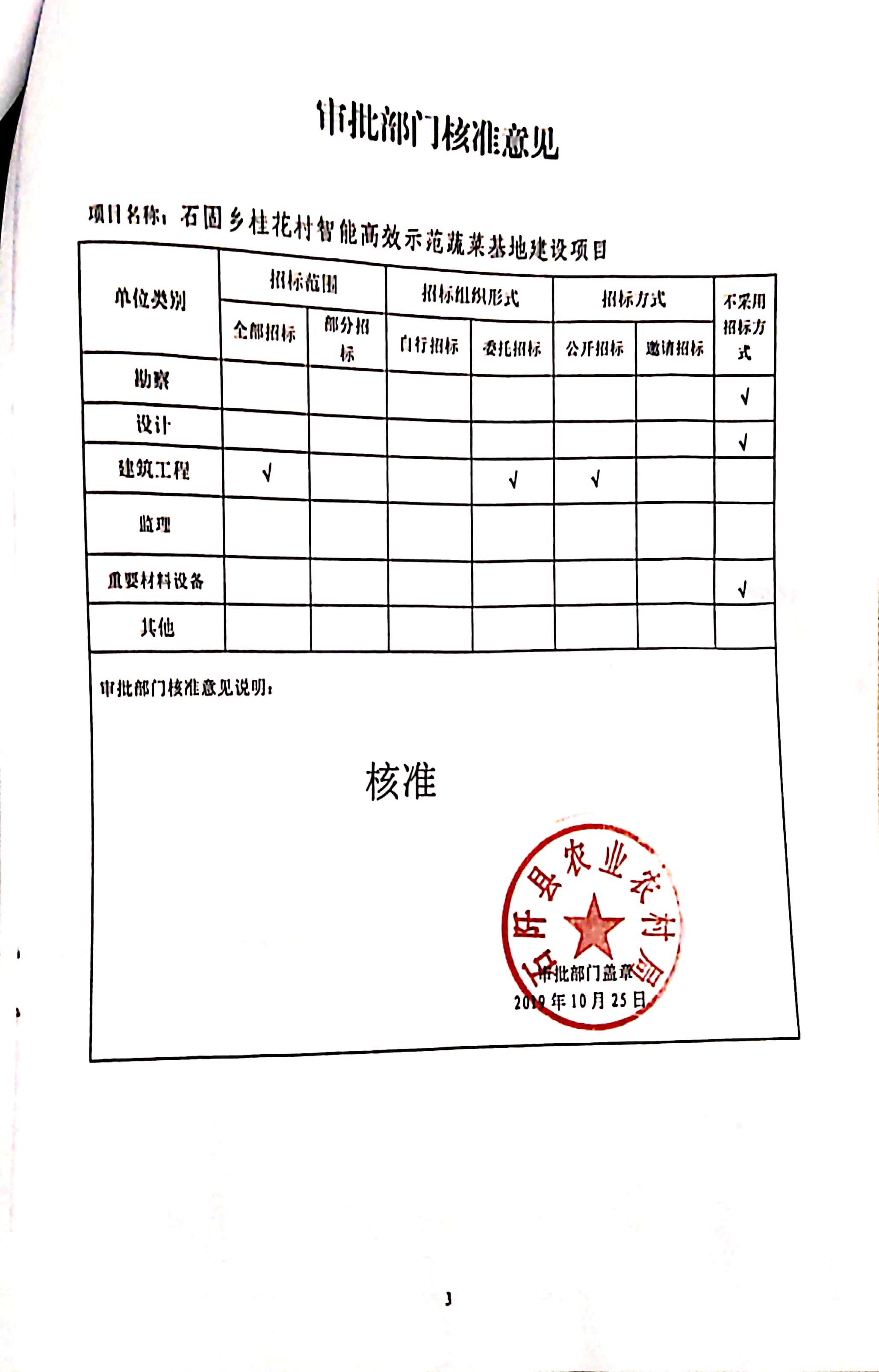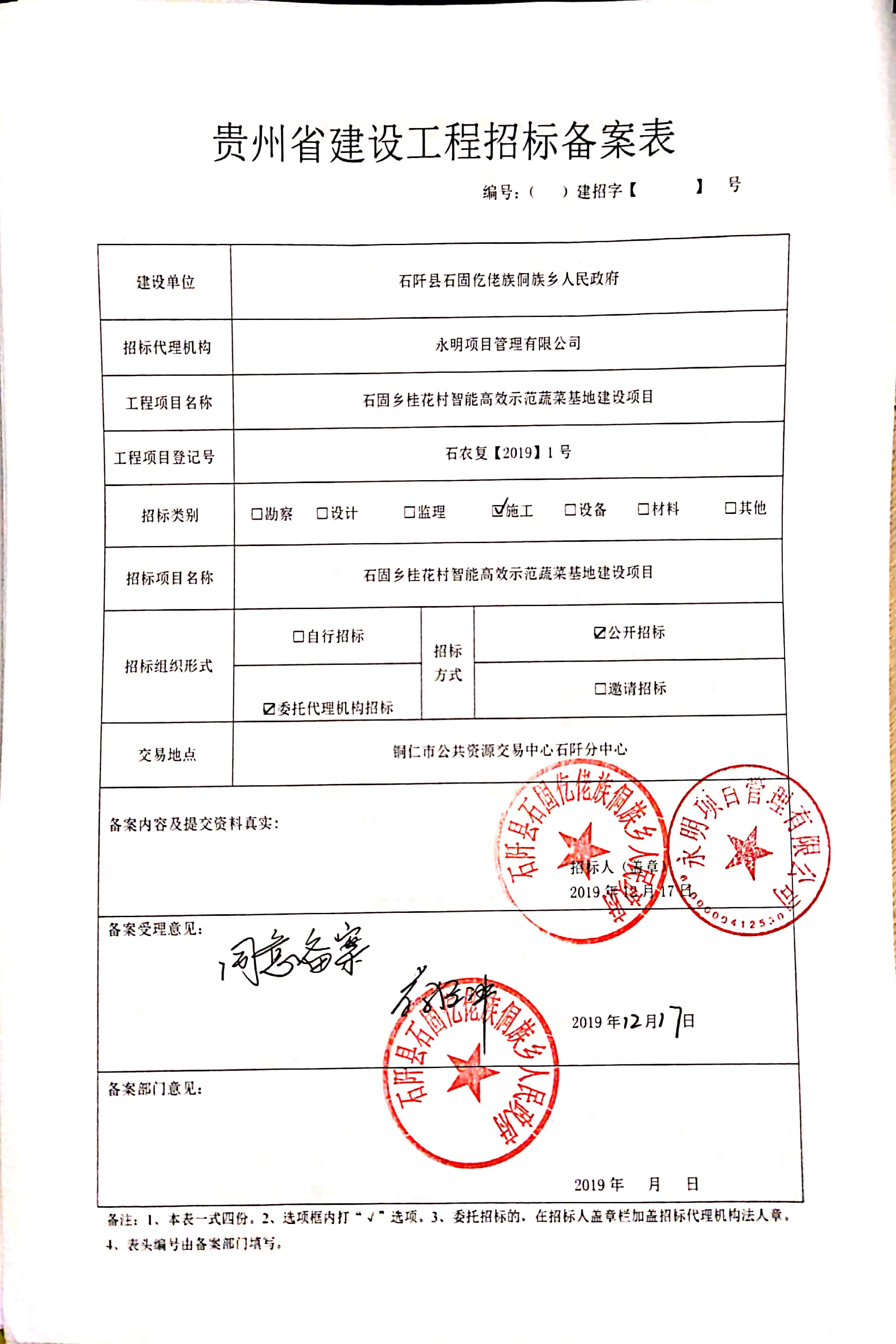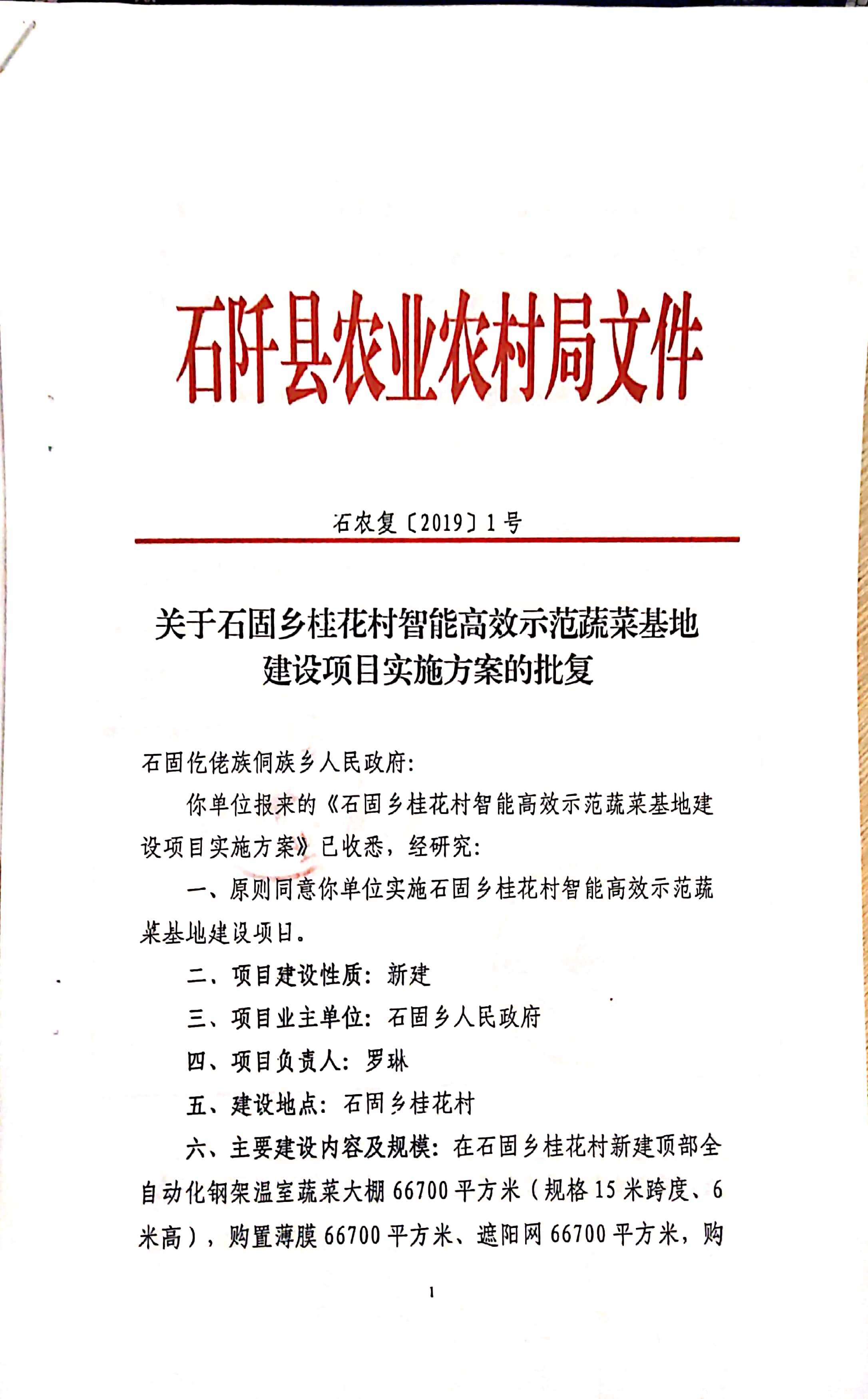 本招标项目石固乡桂花村智能高效示范蔬菜基地建设项目招标 ,已由石阡县农业农村局以石农复【2019】1号文件批准建设,招标人为石阡县石固仡佬族侗族乡人民政府 ,资金来自财政专项扶贫资金,项目已具备招标条件,现对该项目的施工进行公开招标。