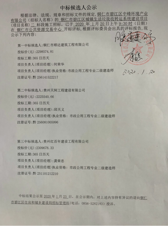 根据法律、法规、规章和招标文件的规定,铜仁市碧江区中峰环境产业有限公司(招标人名称)的铜仁市碧江区城镇生活垃圾收转运系统建设项目(项目名称)二标段施工招标,已于2020年1月20日上午9:30时(日期)在铜仁市公共资源交易中心 开标评标,根据评标委员会出具的评标报告,现公示下列内容: