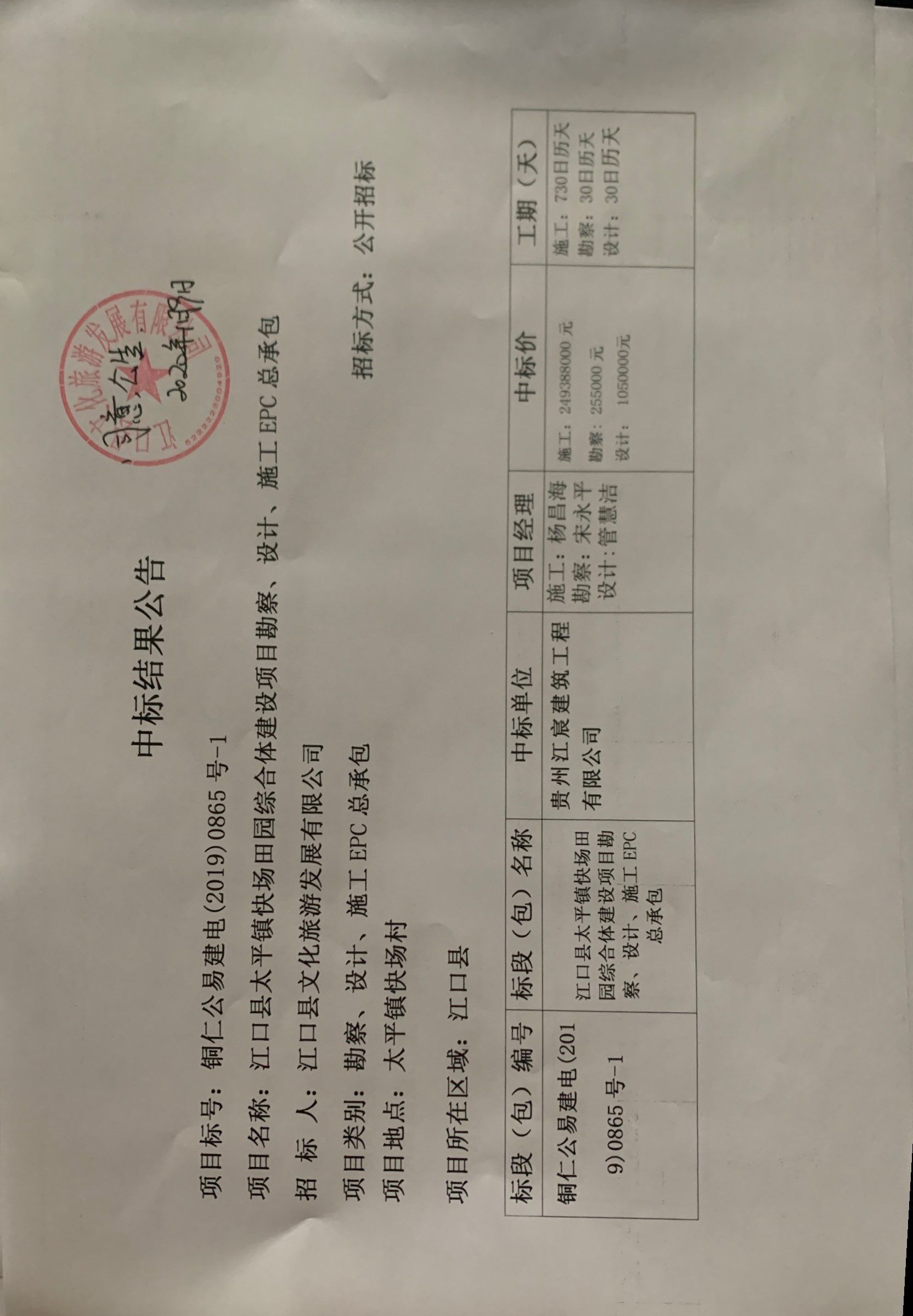 标段(包)名称 | 江口县太平镇快场田园综合体建设项目勘察、设计、施工EPC总承包 | |||||||