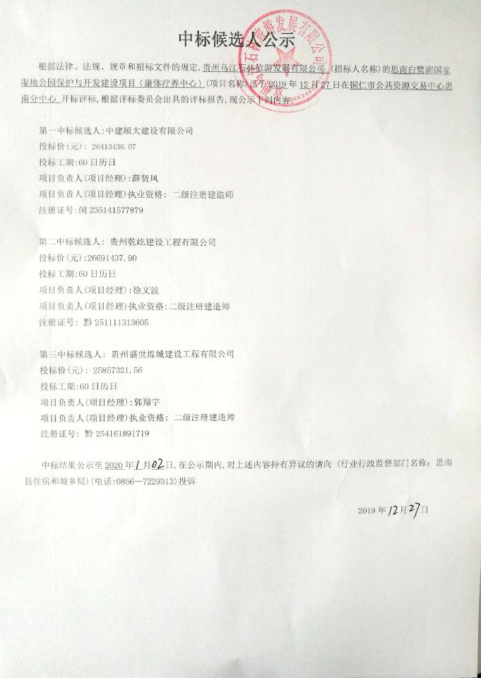 根据法律、法规、规章和招标文件的规定,贵州乌江石林旅游发展有限公司(招标人名称)的思南白鹭湖国家湿地公园保护与开发建设项目(康体疗养中心)(项目名称)已于2019年12月27日在铜仁市公共资源交易中心思南分中心 开标评标,根据评标委员会出具的评标报告,现公示下列内容:
