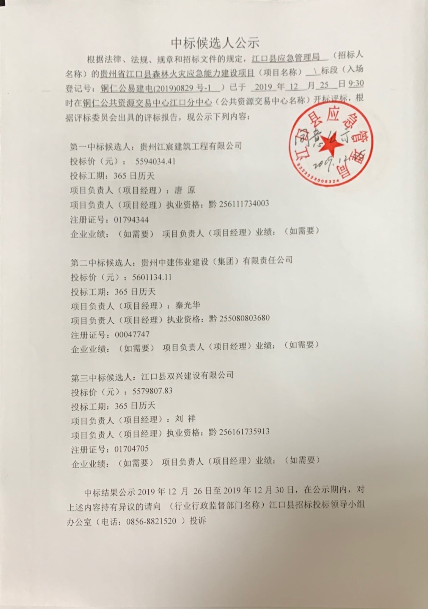 中标结果公示2019年12月 26日至2019年12月30日,在公示期内,对上述内容持有异议的请向 (行业行政监督部门名称)江口县招标投标领导小组办公室(电话:0856-8821520)投诉