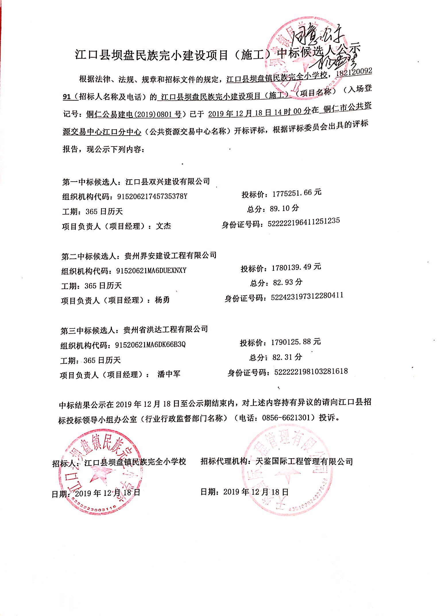 第一中标候选人:江口县双兴建设有限公司