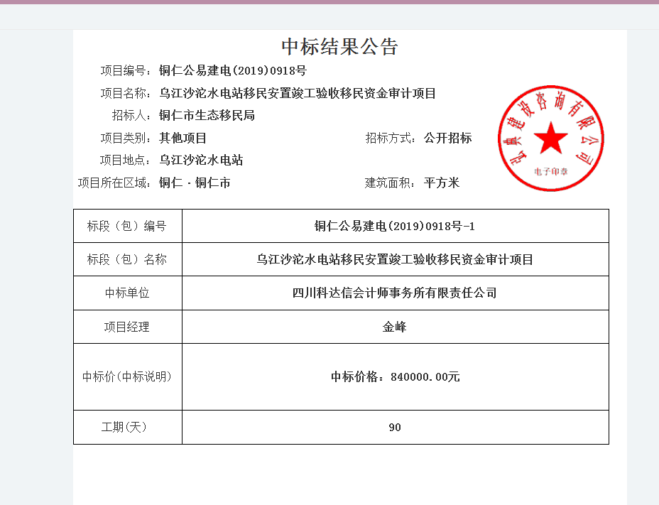 中标单位 | 四川科达信会计师事务所有限责任公司 | |||||||
