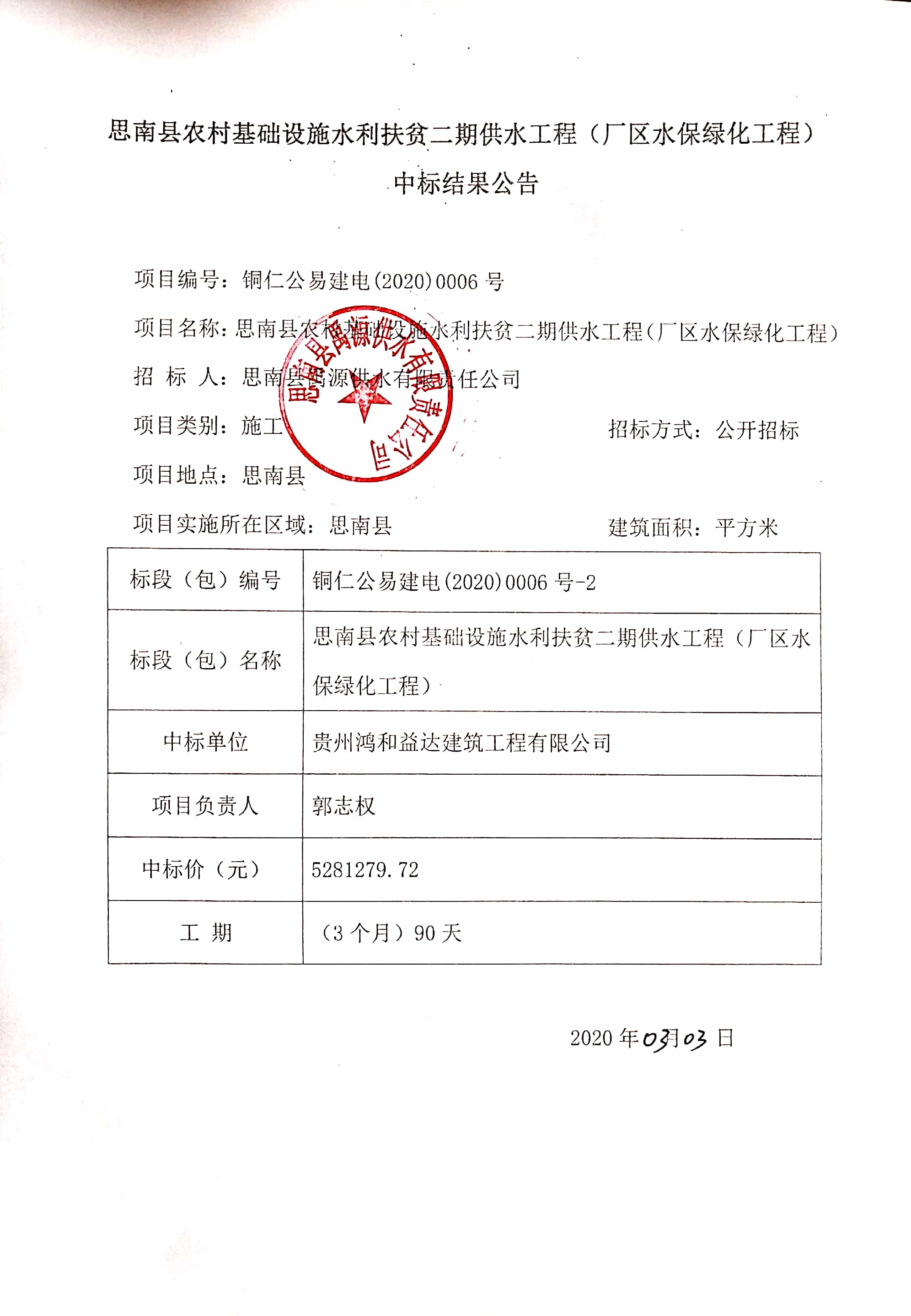 标段(包)名称 | 思南县农村基础设施水利扶贫二期供水工程(厂区水保绿化工程) | |||||||