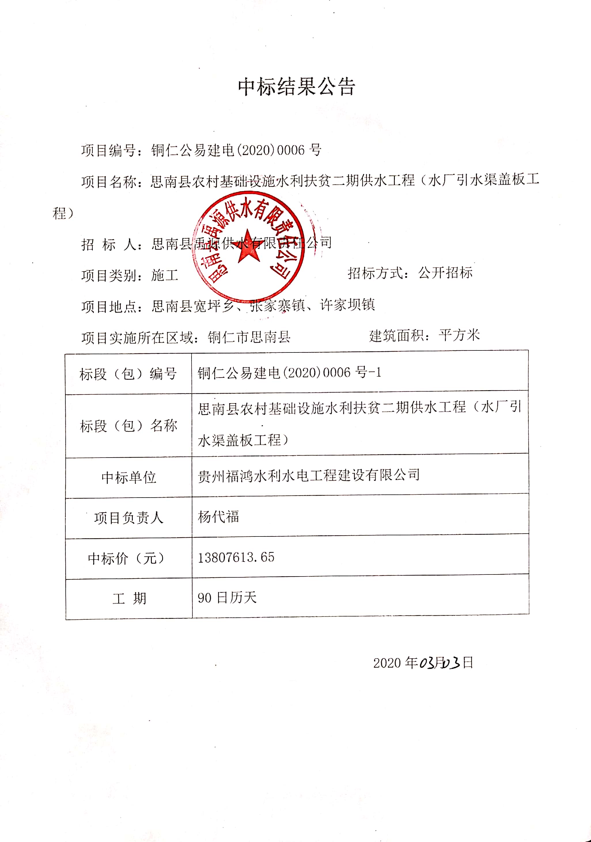 中标单位 | 贵州福鸿水利水电工程建设有限公司 | |||||||